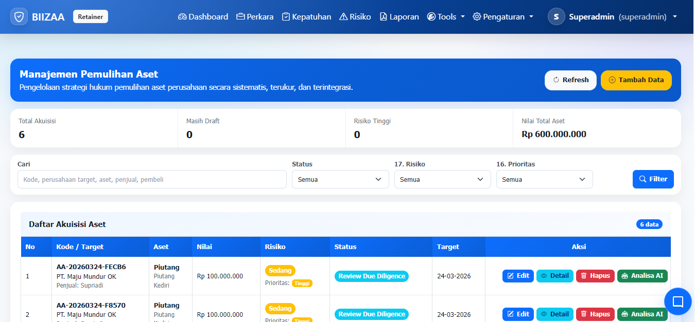Di sisi lain, Retainer Biizaa tidak hanya berfokus pada pemulihan aset yang telah bermasalah, tetapi juga pada pencegahan risiko kehilangan aset di masa mendatang. Melalui modul manajemen risiko hukum, setiap aset dianalisis berdasarkan tingkat kemungkinan terjadinya risiko (likelihood) dan dampak yang ditimbulkan (impact). Hasil analisis ini menghasilkan pemetaan risiko yang membantu entitas dalam menentukan prioritas penanganan serta langkah mitigasi yang diperlukan. Dengan demikian, potensi kerugian dapat diminimalkan sebelum berkembang menjadi permasalahan hukum yang lebih kompleks.
